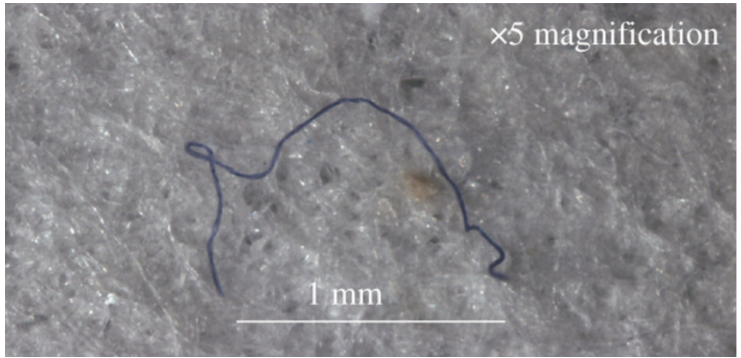 Figure 4: A microfiber found within an amphipod from 10,890 m deep in the Mariana Trench. (Jamieson et al., 2019) https://doi.org/10.1098/rsos.180667