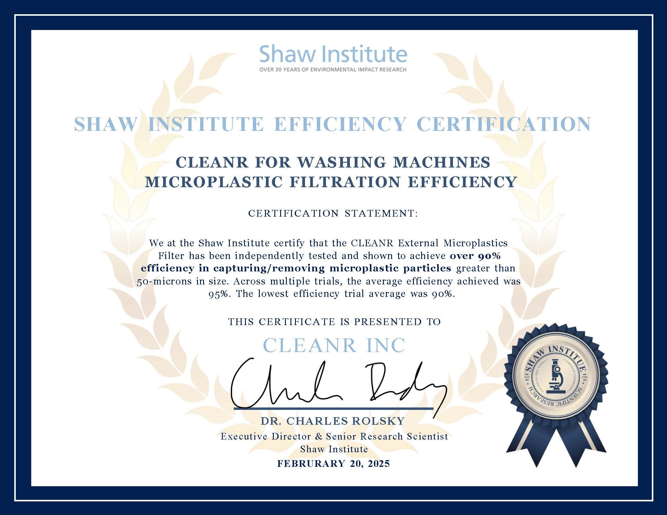 CLEVELAND and BLUE HILL, Maine, Feb. 25, 2025 /PRNewswire/ — The Shaw Institute, a nonprofit science research organization, has tested CLEANR’s external microplastic filter for washing machines and certified it to be over 90% efficient at capturing microplastics as small as 50-microns. CLEANR for Washing Machines will be available for purchase in the U.S. later this year.