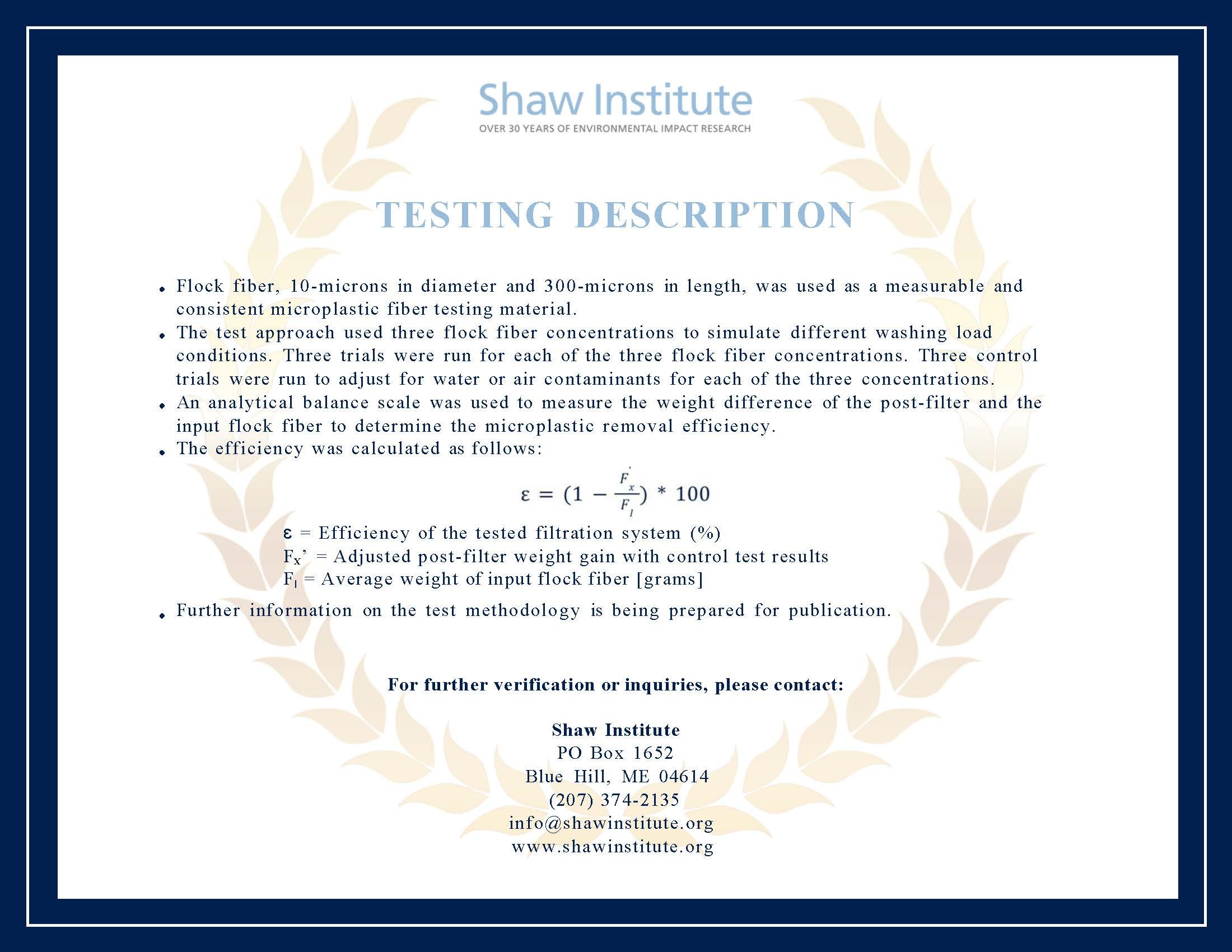 The Shaw Institute tested the effectiveness of CLEANR for Washing Machines by running a mix of tap water and plastic flock fibers (10 microns in diameter and 300 microns in length) through the filter at various concentration levels to simulate real world laundry conditions. The test was repeated three times in January and February and resulted in 90%, 97%, and 98% microplastic fiber removal rates.