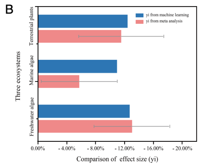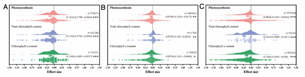 Figure 2: Effect sizes on photosynthesis following microplastic exposure for (A) terrestrial plants; (B) marine algae; (C) freshwater algae (Zhu et al. 2025) https://doi.org/10.1073/pnas.2423957122