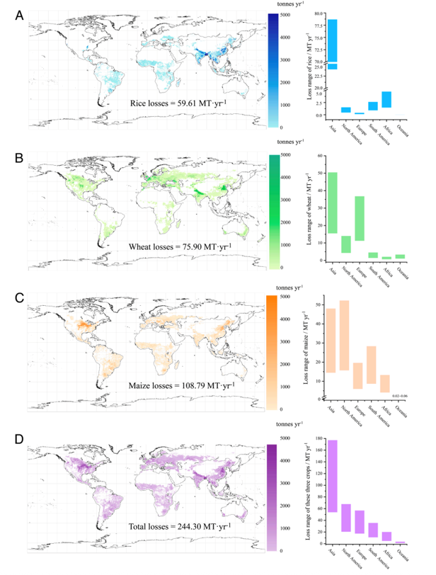 Figure 4: The maps on the display the median value of the predicted annual production losses due to microplastic pollution, while the floating bar charts on the right illustrate the range of annual losses for the corresponding crop (Zhu et al. 2025) https://doi.org/10.1073/pnas.2423957122